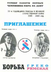 В годовщину Победы в Великой Отечественной войне Союз "БОРЕЦ" проводит Турнир памяти первых чемпионов мира на Дону, заслуженных мастеров спорта СССР - Гургена Шатворяна и Владимира Сташкевича, который состоится в г. Ростове-на-Дону 8-9 мая 2000 г. в 11-00 в спортивном зале "ГЕРКУЛЕС" в Парке Островского.